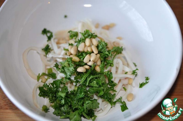 Добавляем к кальмару мелкопорубленную петрушку и подсушенные на сковороде кедровые орешки.