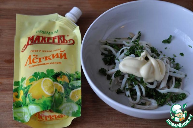 Для заправки берём майонезный соус "Лёгкий с лимонным соком" от "Махеевъ", заправляем им кальмары.