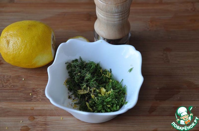 Для этого: очень мелко режем укроп, добавляем сок лимона и лимонную цедру, уксус для суши, оливковое масло, соль и свежемолотую смесь перцев.