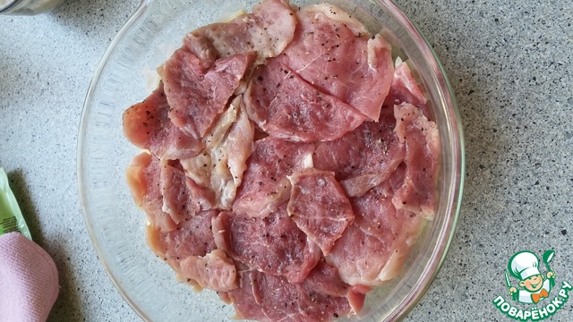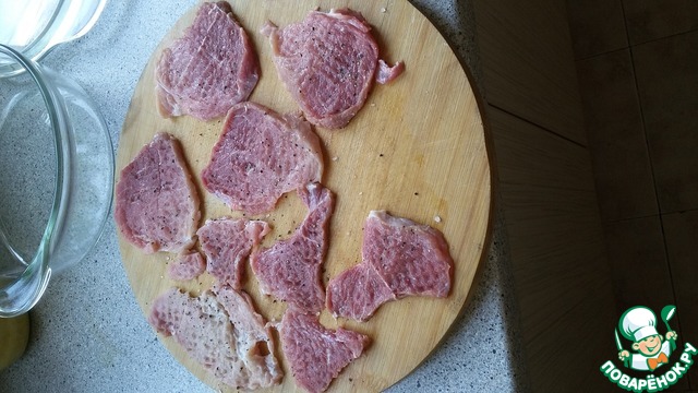 Мясо нарезаем на удобные для вас кусочки, отбиваем, солим и перчим.