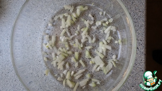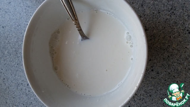 Теперь делаем заливку. Оставшийся майонез, это 3 ст. л. смешиваем со сливками и чесноком, выдавленным через чеснокодавку. Хорошо перемешиваем заливку вилкой.