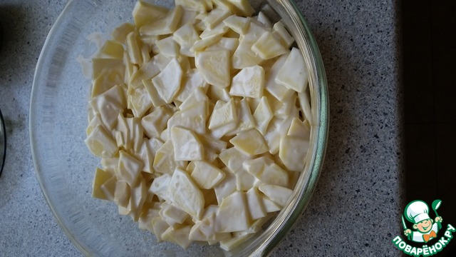 Картошку режем тонкими ломтиками, добавляем к картошке 2 ст. л. майонеза, солим ( по желанию перчим). Хорошо перемешиваем картошку и выкладываем в форму на грибы.