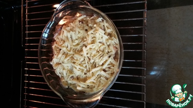 Через 35 мин. достаем наше мясо, посыпаем натертым сыром и отправляем в духовку еще на 10-15 мин.