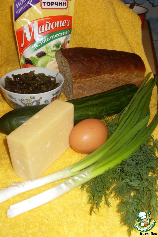Куриное мясо мелко рубим и смешиваем с майонезом и чесноком. Намазываем на наши гренки. Дальше берем морскую капусту и измельчаем ее (я пользовалась блендером), но не в кашу. Выкладываем на бутерброды.