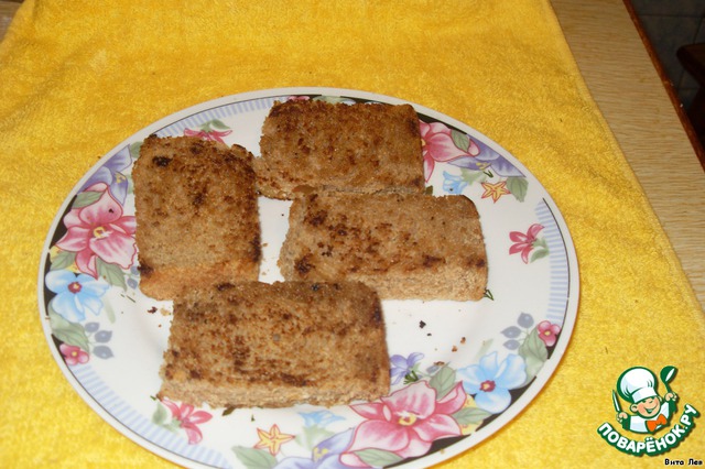 Режем хлеб в форме прямоугольников и обжариваем его с двух сторон.