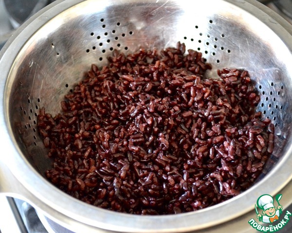Первым делом, промойте и отварите нужное количество чёрного риса в слегка подсоленной воде до готовности (около 20-25 минут). Готовый рис промойте и остудите. Удивительно, при варке этого риса вода окрашивается в пурпурный цвет, а сам рис издает приятный аромат, схожий с ароматом свежеиспеченного хлеба!