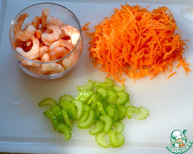 Креветки отварить 2 минуты в кипящей воде вместе с лавровым листом и несколькими горошинками чёрного перца. Очистить хвостики готовых креветок. Одну рупную морковь (или две средних) очистите и нарезать жульеном (тонкими полосочками). Стебель сельдерея также тонко нарезать.