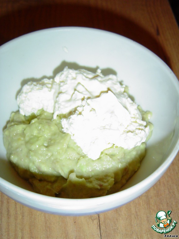 Пока корзиночки запекаются, готовим крем. Для этого измельчаем с помощью блендера очищенный авокадо, сельдь.