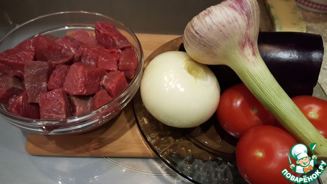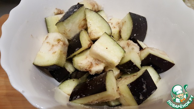 Баклажан нарезать крупным кубиком, посыпать солью, перемешать и оставить на 20 минут.