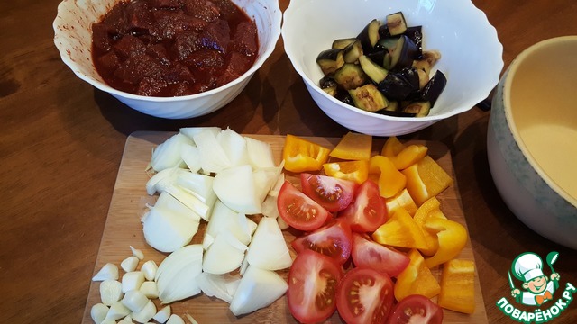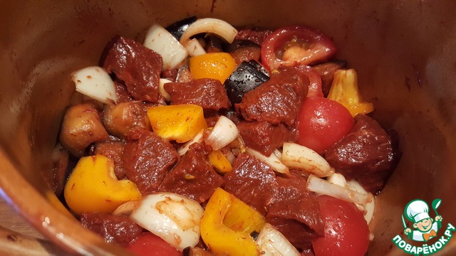 Наливаем в горшок для запекания оливковое масло. Выкладываем мясо и овощи и перемешиваем.
