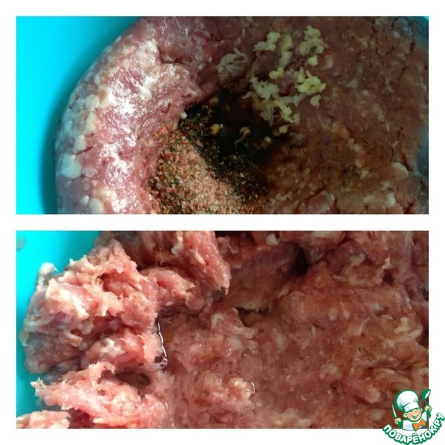 В фарш добавить специи, соль, соевый соус и чеснок пропущенный через пресс. Вымесить фарш и добавить воды. Вымесить фарш еще раз.