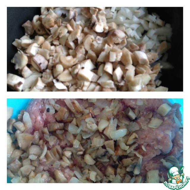 У шампиньонов вытащить ножки, почистить, порезать маленьким кубиком. Лук тоже нарезать маленьким кубиком и обжарить вместе с ножками шампиньонов на растительном масле. Остывшую зажарку из грибов и лука добавить к фаршу, и тщательно перемешать.