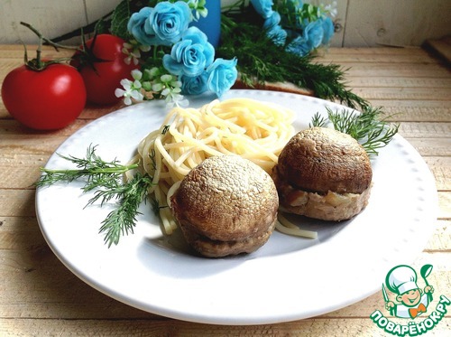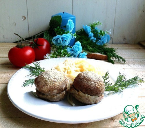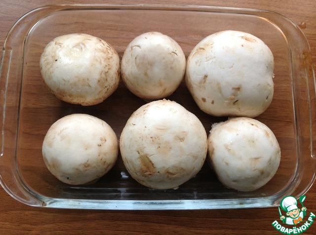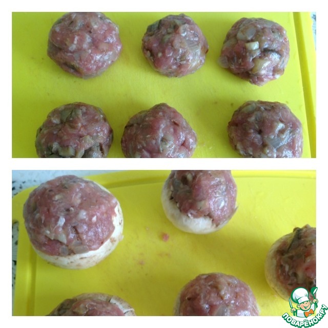 Сформировать из фарша тефтельки размером чуть больше шляпки шампиньонов. Шляпки внутри почистить (поскоблить) ножом. Шляпки шампиньонов одеть на тефтели.