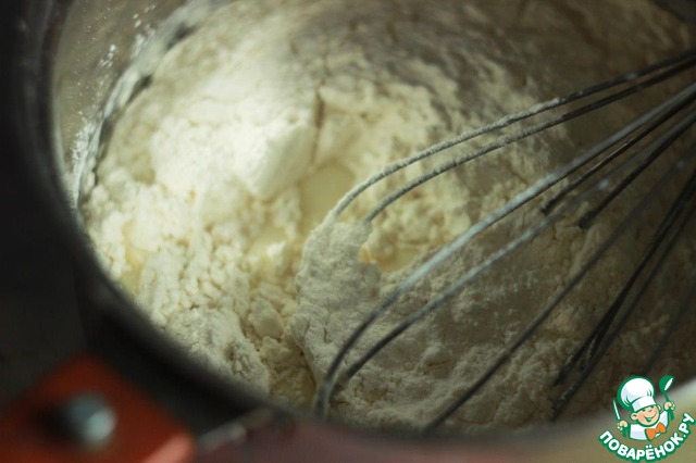 Добавьте половину молока, всю муку и перемешайте до однородности.