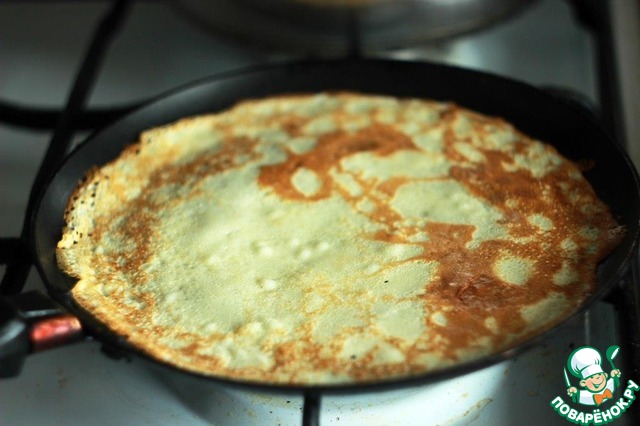 Выпекайте блины с обеих сторон до золотистого цвета на сковороде, смазывая ее растительным маслом (чтобы не переборщить, я смазываю сковороду маслом при помощи силиконовой кисточки).