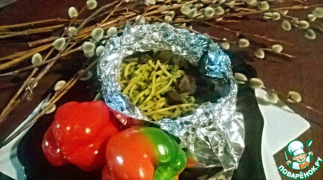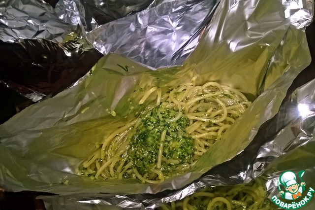 Сделать из фольги конвертики. В них положить спагетти, соус и грибы