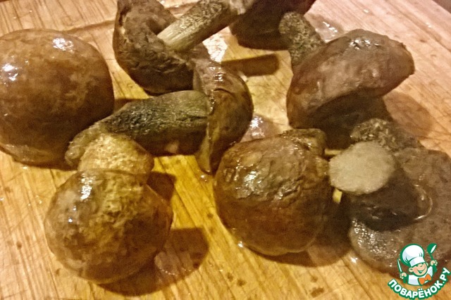 Грибы разморозить, разрезать каждый на 4 части и обжарить на растительном масле "Олейна"