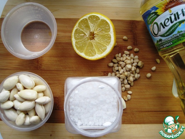 Положим в чашу блендера миндаль, кедровые орешки, подсолнечное масло ТМ Олейна, чеснок, соль, лимонный сок и 160 мл воды.