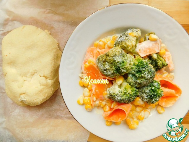 Пока сыр запекался, я приготовила овощи в миндальном молоке. Учитывая, что в миндальном молоке достаточно приправ, я овощи дополнительно не приправляла. И так, на сковороде под крышкой в течении 10-ти тушим замороженные брокколи и зёрна кукурузы. Далее выливаем в сковороду миндальное молоко и продолжаем тушить до готовности овощей. А пока морковь почистим и нарежем тонкими полосками, используя овощечистку. Добавляем морковь к овощам за пару минут до их готовности.