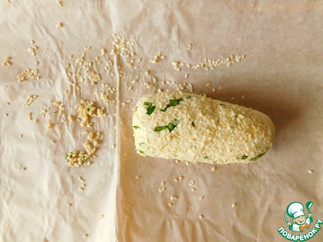 Формируем небольшую колбаску, прокатываем её по рассыпанному кунжуту, слегка прижимая кунжут к сыру.