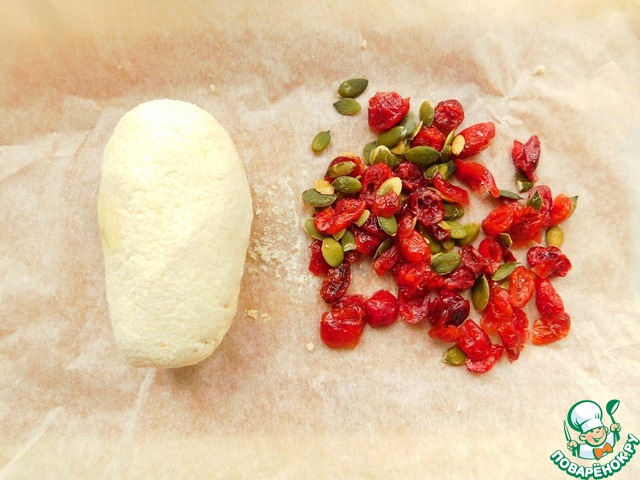 Во вторую часть сыра я ни чего не добавляла. Формируем похожую колбаску и прокатываем её на рассыпанной смеси клюквы и тыквенных семечек, слегка прижимая их к поверхности сыра.