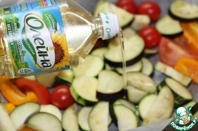 Кабачок нарезать шайбами, помидоры четвертинками. Болгарский перец освободить от семян и перегородок, нарезать сегментами. Все подготовленные овощи плюс черрики выложить в жаропрочную форму, посыпать орегано, солью и перцем, полить подсолнечным маслом Олейна, запекать в разогретой до 180 градусов духовке