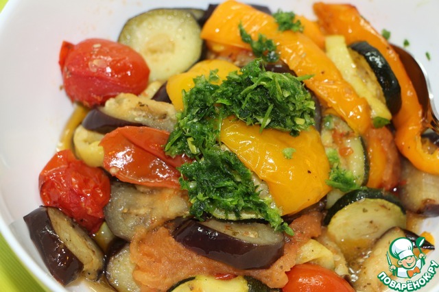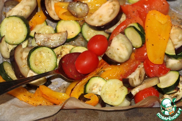 Овощи необходимо пару раз перемешать, чтобы они не варились, а запекались. Это займет где - то 30-40 минут.