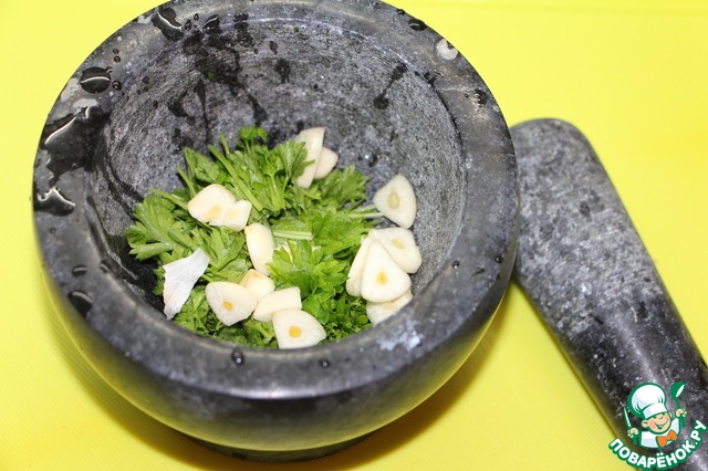 Пока овощи запекаются порезать чеснок лепестками, листья петрушки порвать руками.