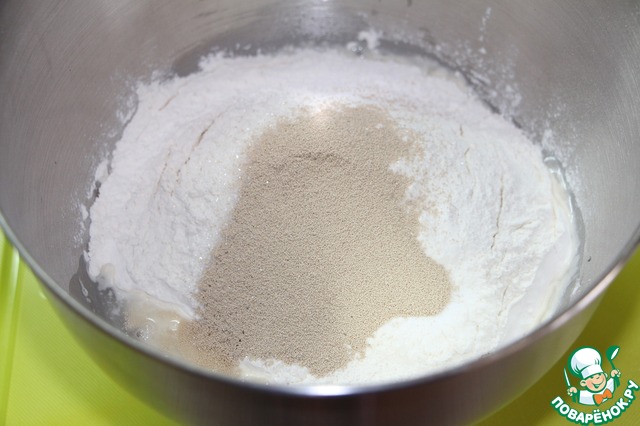 В посуду где будем месить тесто налить теплую воду, всыпать муку, соль, сахар и сухие дрожжи.
