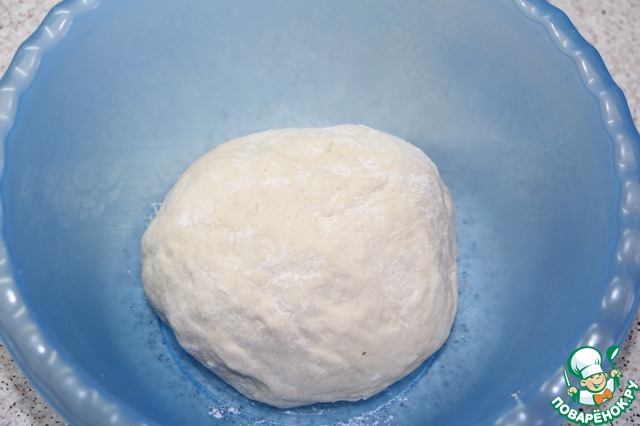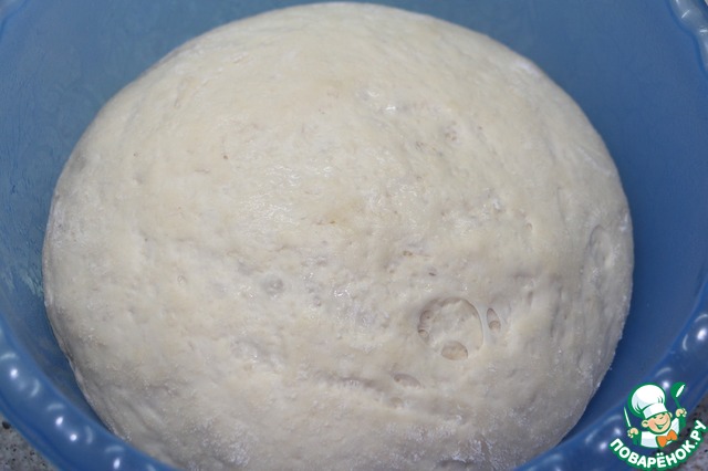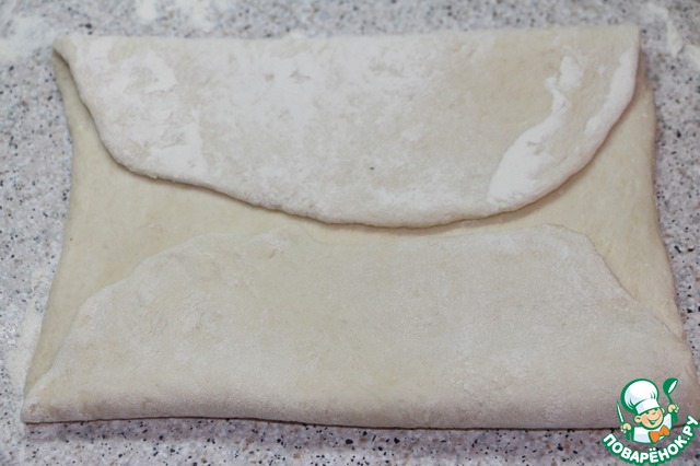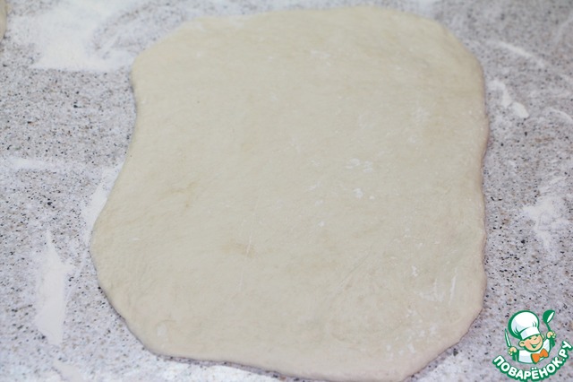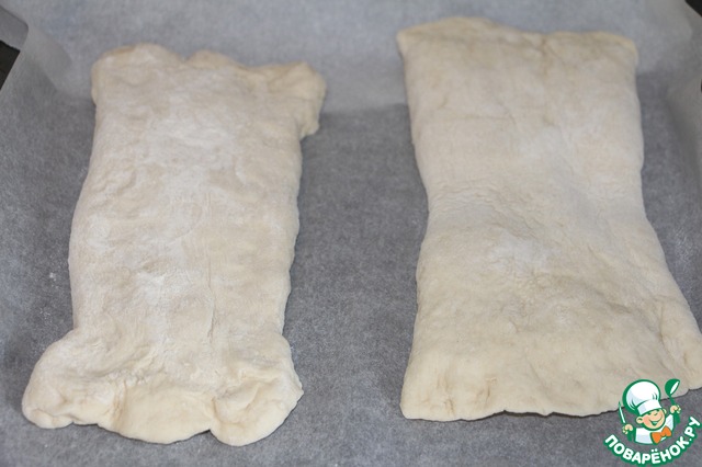 Поднявшееся тесто выложить на рабочую поверхность щедро посыпанную мукой и разделить на две части. Руками!, не скалкой! растянуть аккуратно тесто во все стороны, как бы расплескивая его по поверхности стола, придавая форму прямоугольника.