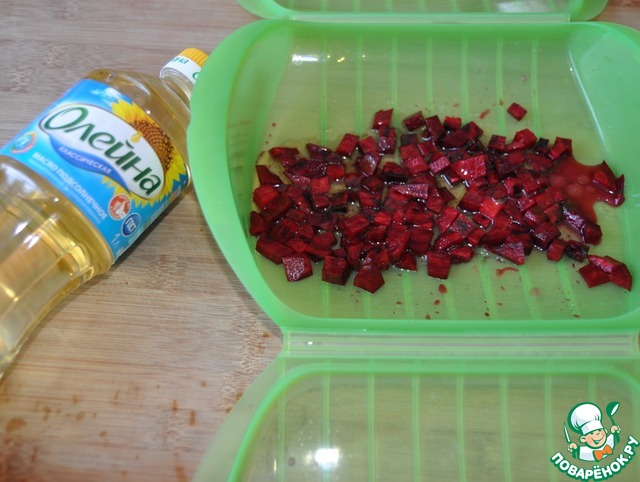 Берём удобную форму (тарелку, кастрюлю) для СВЧ печи, кладём в неё порезанную свеклу, поливаем 1 ст. ложкой подсолнечного масла от "Олейны" и 2 ст. ложками воды, перемешиваем, ставим в СВЧ печь на максимальную мощность (у меня 800 Вт) на 2 минуты.