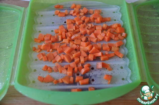 Морковь моем, чистим, режем кубиками и кладём сверху свеклы (у меня есть специальный поддон), ставим в СВЧ печь ещё на 2 минуты на полную мощность.
