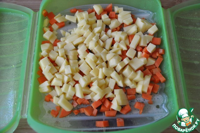 Картофель моем, чистим, режем кубиками, кладём сверху моркови и ставим ещё на 6 минут в СВЧ печь на полную мощность.