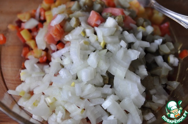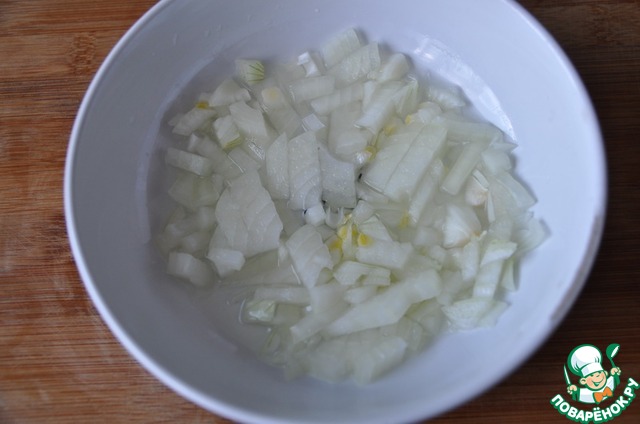 Лук чистим, режем мелкими кубиками. Маринуем в растворе из соли, сахара, уксуса и 50 мл воды.
