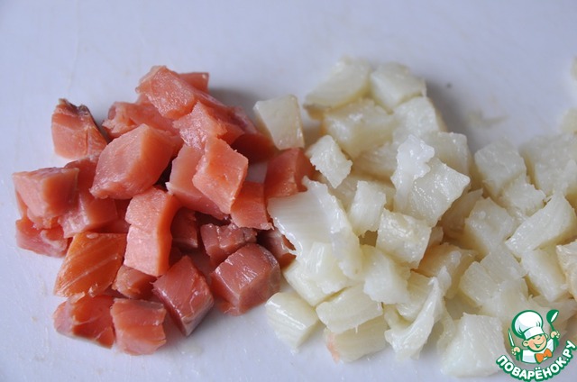 Палтус и лосось (у меня малосольная кета), режем мелкими кубиками.