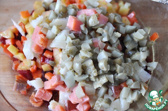 К варёным овощам добавляем порезанную рыбу. Кладём порезанные кубиками маринованные огурцы.