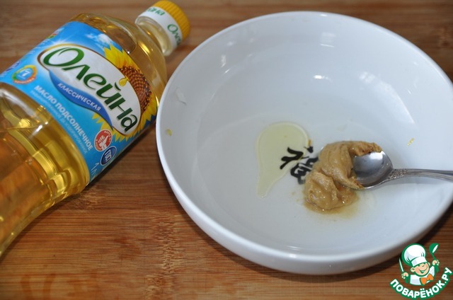 Готовим заправку. В оставшийся маринад добавляем горчицу и оставшееся подсолнечное масло от "Олейны", перемешиваем.