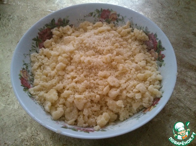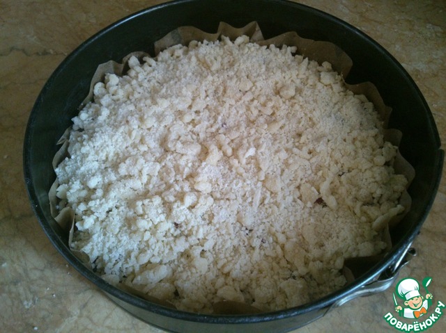 Делаем крошку: желток растираем с сахаром, добавляем порубленное сливочное масло и постепенно добавляем муку. Крошку я делала с помощью вилки. Полученную крошку можно пока поместить в холодильник.