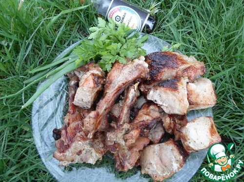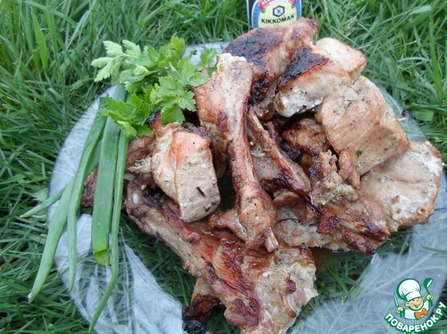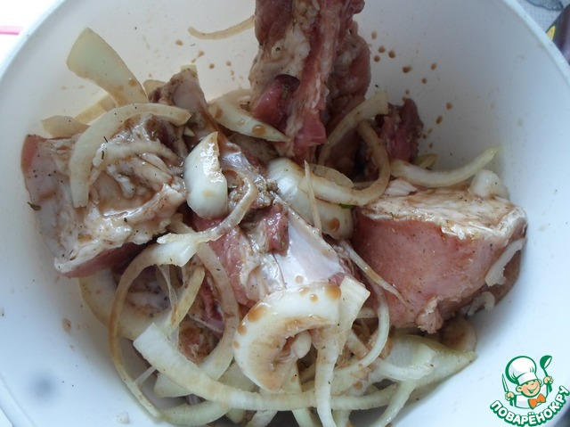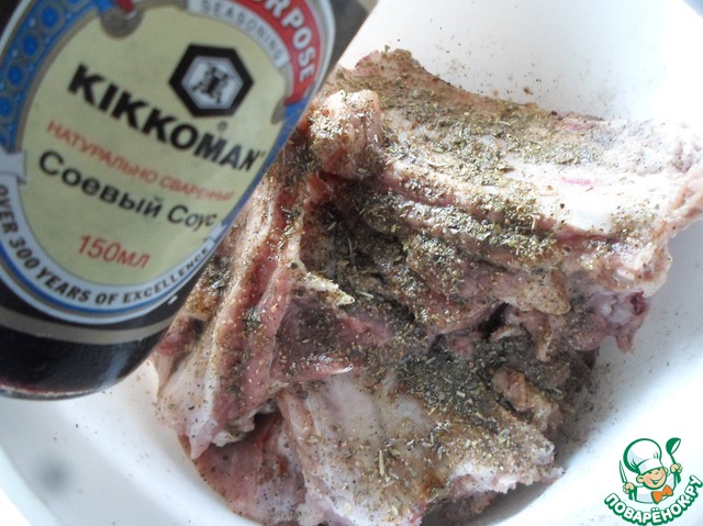 Мясо (у меня ребра и не много мякоти) режем на куски. Добавляем все специи и соевый соус, перемешиваем.
