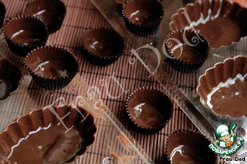 Взять формочки, распределить с помощью кисточки половину растопленного шоколада по стенкам и дну. Дать остыть до комнатной температуры, после чего поставить на 15 минут в холодильник. Достать, нанести еще один слой шоколада и снова поставить застывать.