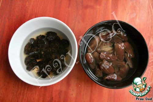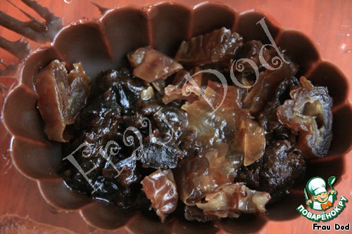 Для приготовления начинки замочить в теплой воде финики и чернослив, предварительно удалив из них косточки.