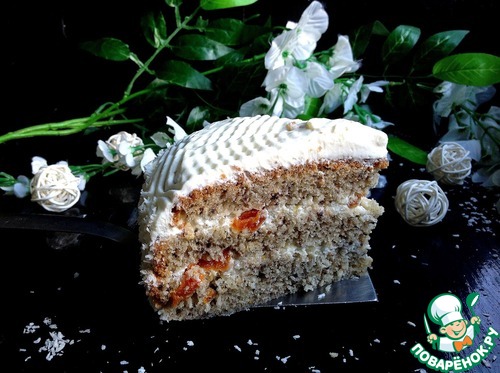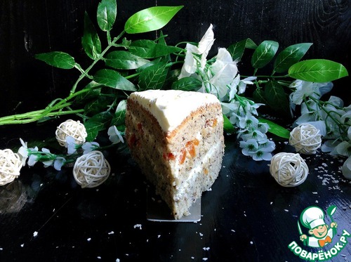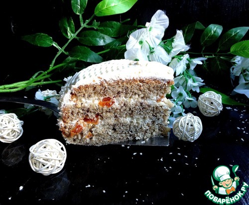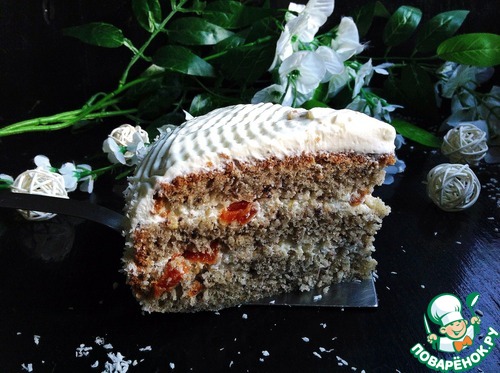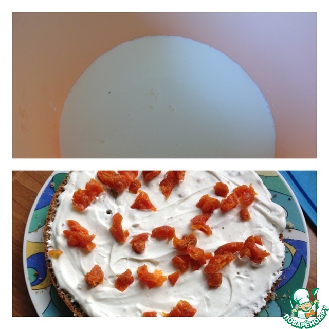 Я предварительно курагу не замачивала, она у меня мягкая как мармелад. Промазать и верх торта, но курагой не посыпать.
