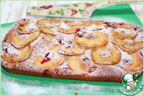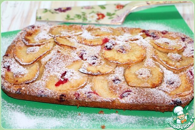 Вылить в форму половину теста, черепицей выложить яблоки, поверх яблок хаотично «разбросать» клюкву, вылить оставшееся тесто. Выпекать в разогретой до 180 градусов духовке 40 минут.