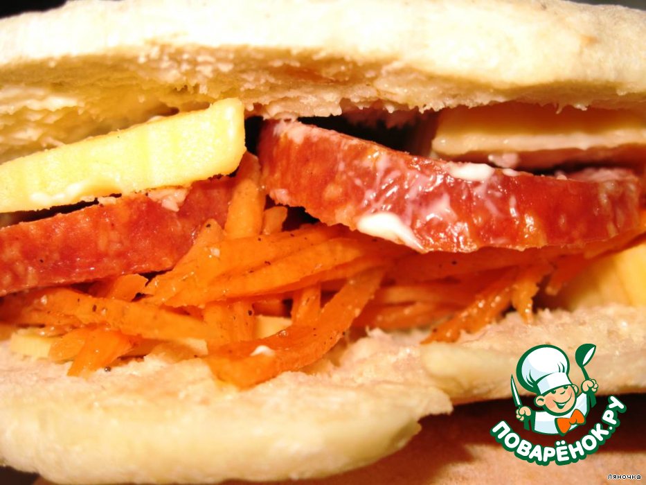 Второй вариант: в питу кладем тонкие ломтики сыра, на них кружочки колбасы (или мяска), корейскую морковь (можно баклажаны по-корейски) и заканчиваем снова ломтиками сыра.
