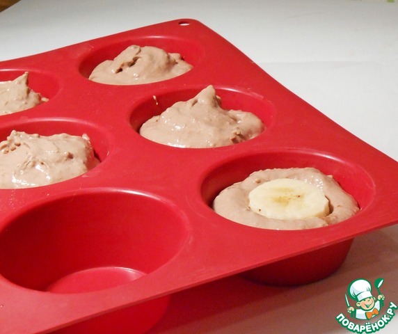 Мы использовали силиконовые формочки, смазывать их не надо. Выкладываем немного теста, вдавливаем кусочек банана, сверху – еще немного теста. Не забываем, что кексы в духовке увеличиваются, поэтому формочки должны быть заполнены не больше, чем на 2/3.