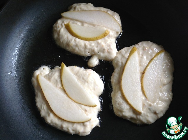 В разогретую сковороду с растительным маслом выложить по 2 ст л теста. Грушу нарезать тонкими пластинками, и по парочке пластин выложить сверху на оладушку. Когда одна сторона поджарится, перевернуть на другую сторону. Оладьи жарить при закрытой крышке, на среднем огне. Даже после выпечки оладьи не оседают и остаются высокими и пышными.