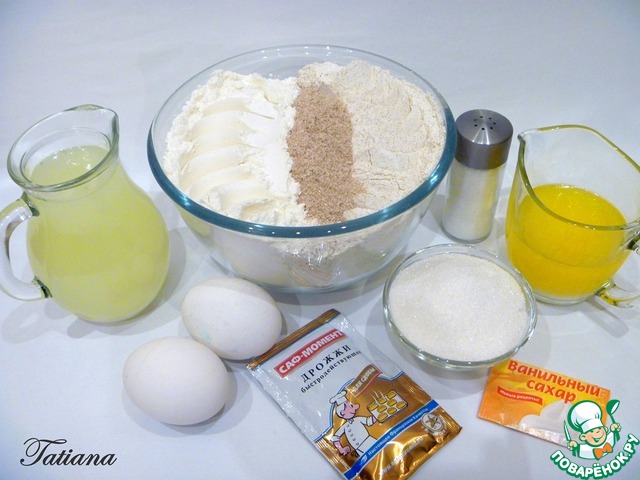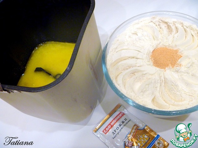 В миске смешайте два вида муки, отруби и дрожжи. В ведерко хлебопечки насыпьте соль (щепотку), сахар и ванильный сахар, влейте теплую сывовортку, перемешанные яйца (отложите 1/3 желтка для смазывания верха булочек перед выпечкой) и растопленное сливочное масло. Поверх жидких ингредиентов всыпьте мучную смесь, включите режим "домашнее тесто".