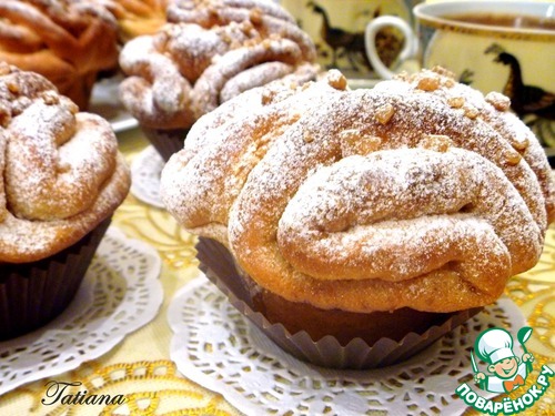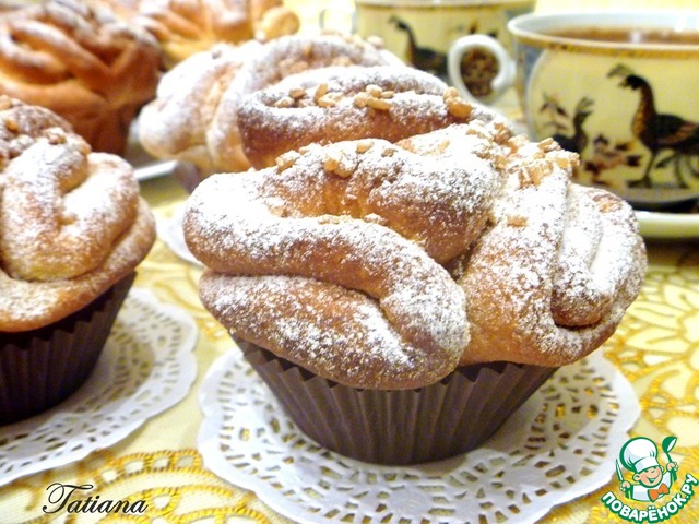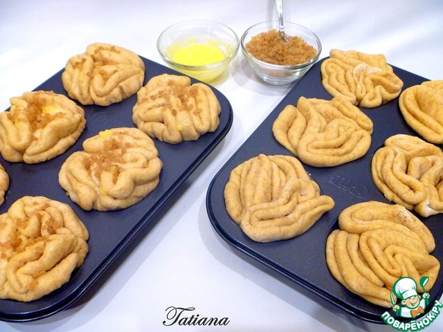 Выпекайте булочки-розочки в разогретой до 200-т градусов духовке, минут 25-30. Остывшие булочки присыпьте сахарной пудрой.