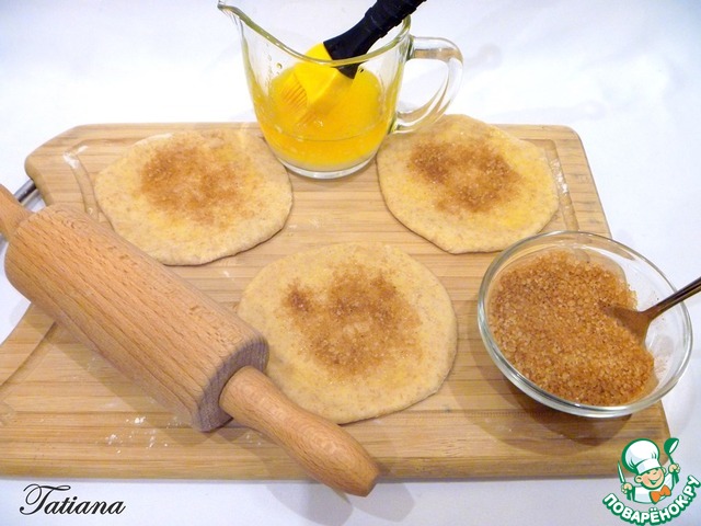 Каждый шарик разделите еще на три маленьких шарика, каждый маленький шарик раскатайте в тоненькую лепешку (d=8-10 см.). Тростниковый сахар перемешайте с корицей. Лепешки смажьте растопленным сливочным маслом, присыпьте сахаром с корицей. Каждую лепешку сложите пополам, затем еще раз пополам, получается "уголок".
