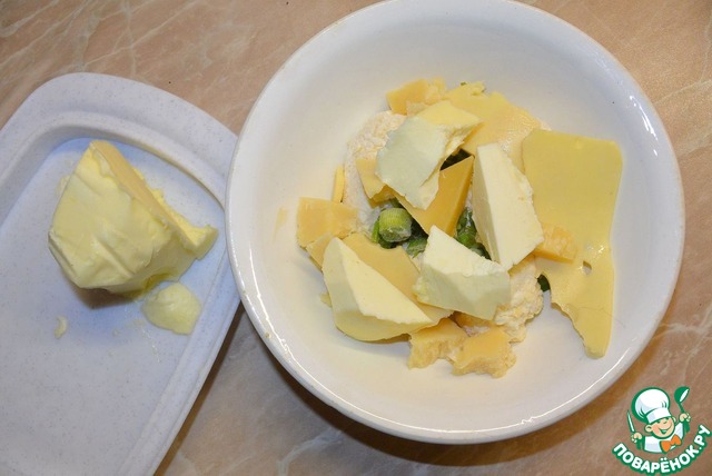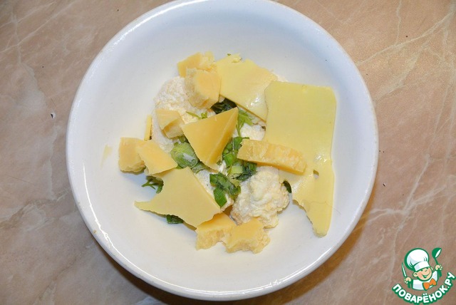 Сыр мелко нарезать (в идеале натереть на терке) и положить в тарелку. Добавить зелень и